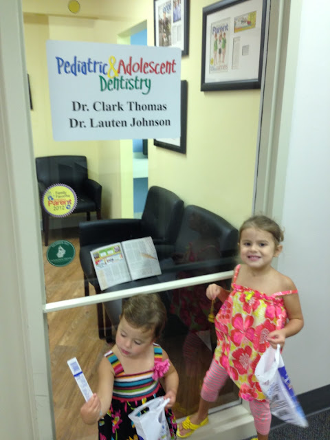 The girls had their second dentist check-up at the beginning of August. They were both pretty pumped about it - then Caroline changed her mind when we arrived. The waiting room is so much fun - so it took Caroline's mind off of things - they had a blast playing with a set of teeth and the cars: